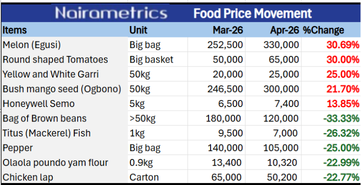 The market survey by Nairametrics tracked a bucket of 67 staple food items across Mushin, Daleko, Mile 12 and Oyingbo markets, showing price moderation strengthened in April.
